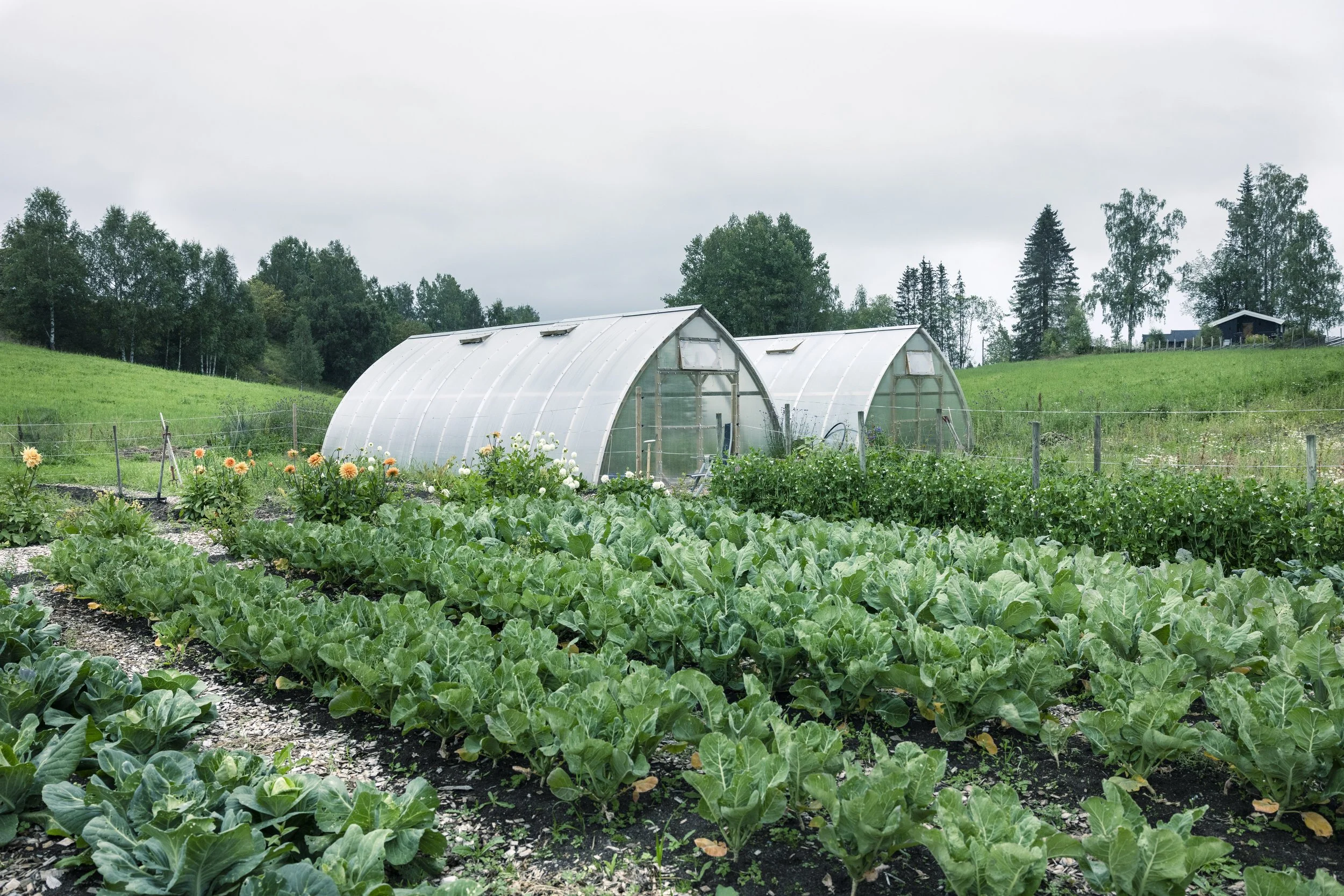 Vi dyrker over 70 forskjellige sorter i sesong, alt økologisk og med norske frø så langt det lar seg gjøre! Sortsutvalget består av alt fra kulturarvstomater til kålsorter gravd frem fra gamle genbanker - alle nøye valgt for å passe inn i vårt klima.